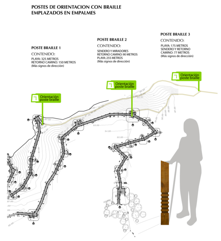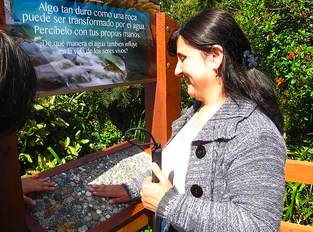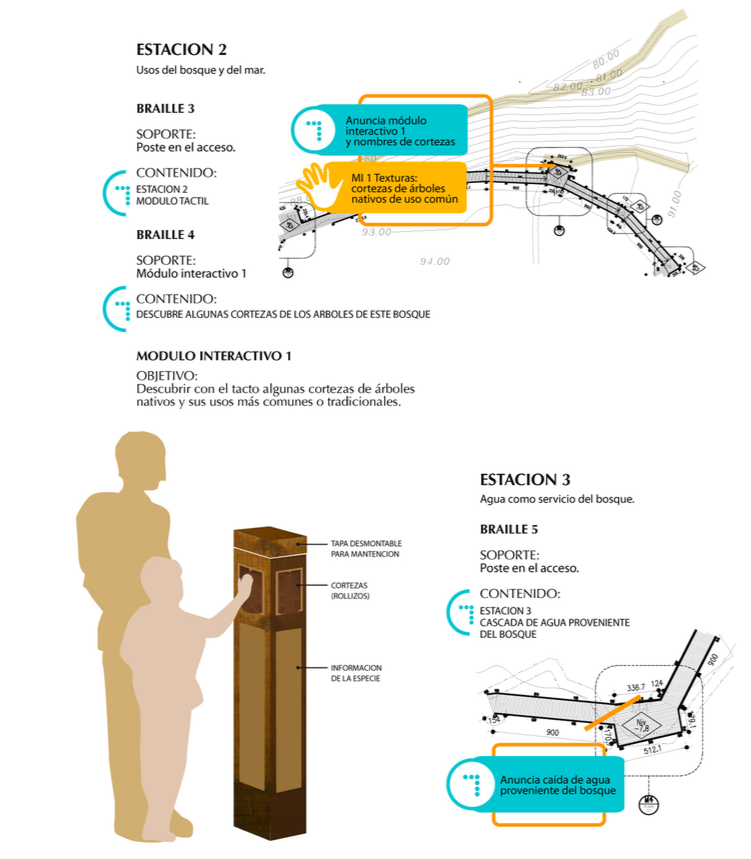 Estaciones interactivas: módulos táctiles con texturas de arena y cortezas, sistema Braille en todo el recorrido y realidad aumentada mediante app / Interactive stations: touch modules, points with Braille system and linked multimedia.
