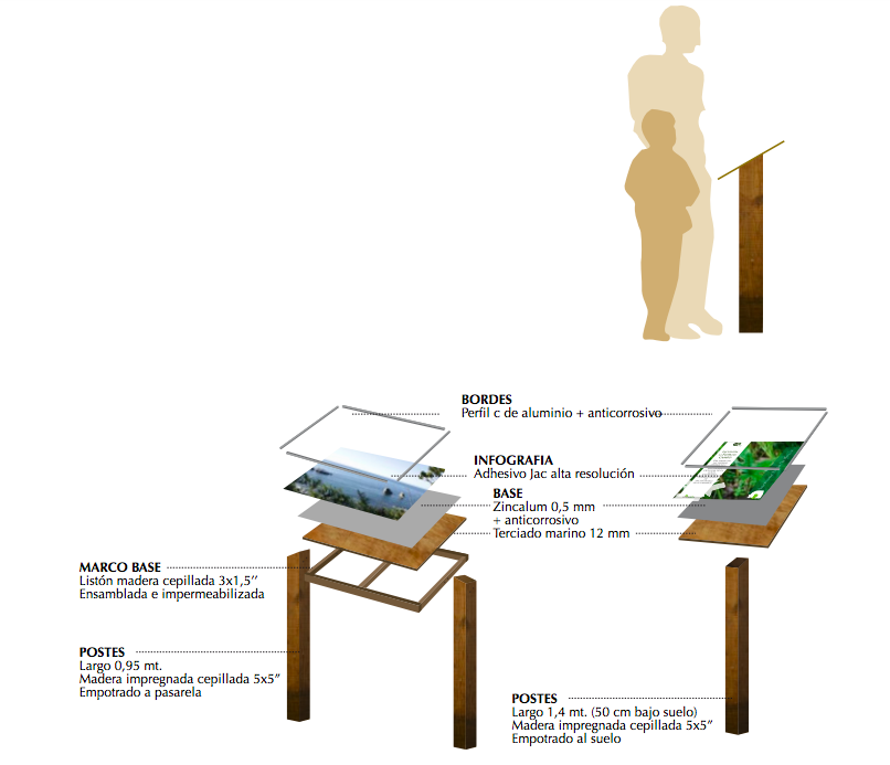 Infografías instaladas en diez hitos interpretativos, más indicaciones de flora / Infographics at ten interpretive landmarks, as well as signs for some plants.