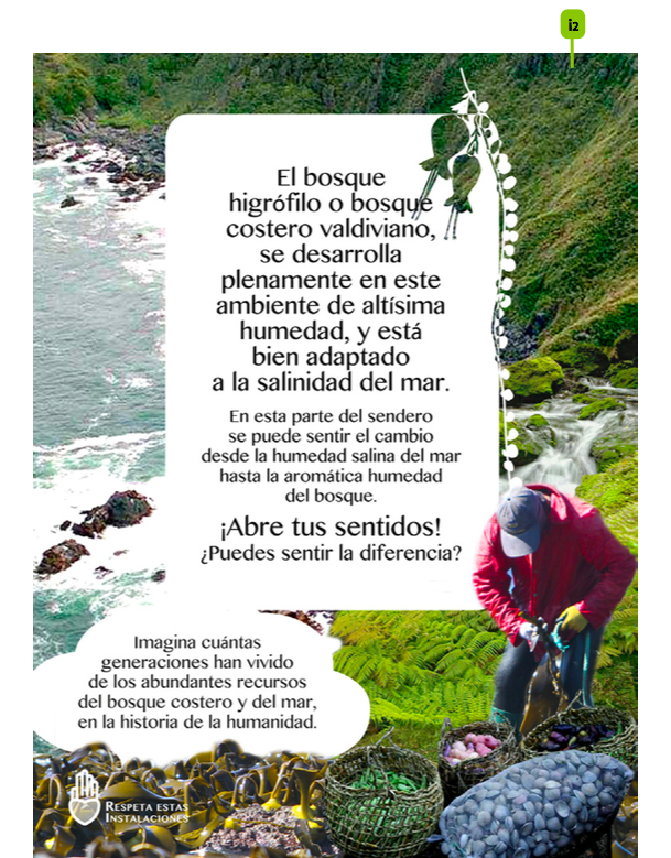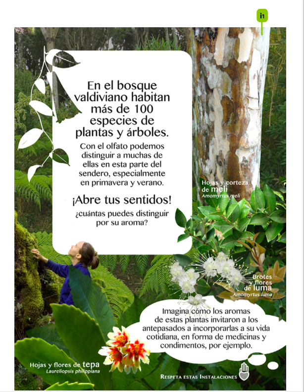 Diseño del relato y contenidos, infografías y soportes de información, con accesibilidad para personas en sillas de ruedas y señalización en sistema Braille para no videntes. Circuito de 1 km aproximadamente. Implementado en 2014 en la Reserva Costera Valdiviana.