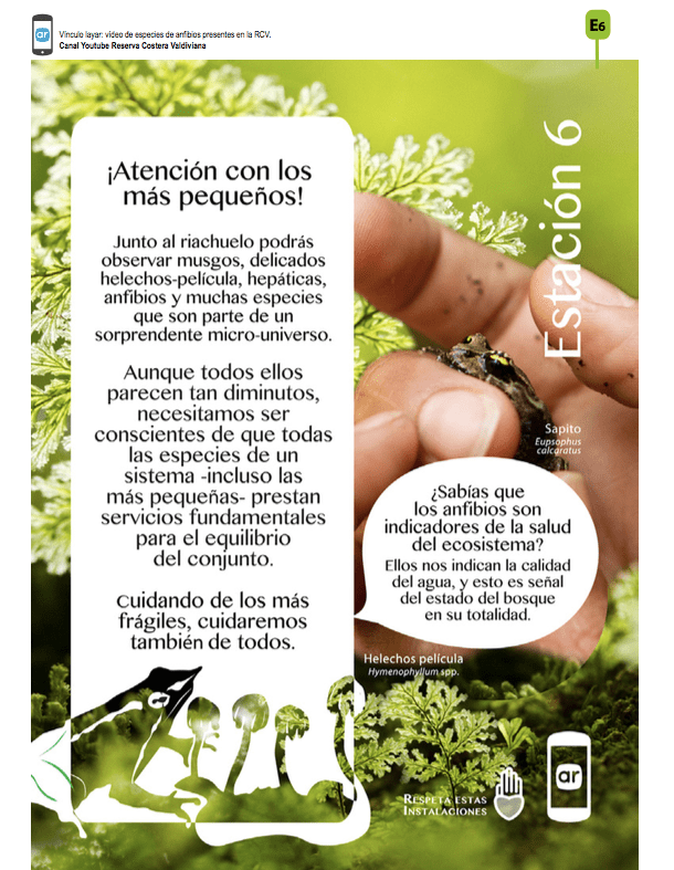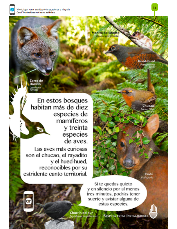 Design of the story and content, infographics and information supports, with accessibility for wheelchairs and Braille signage for blind people. 1 Km long path. Implemented in 2014, in Valdivian Coastal Range Reserve.